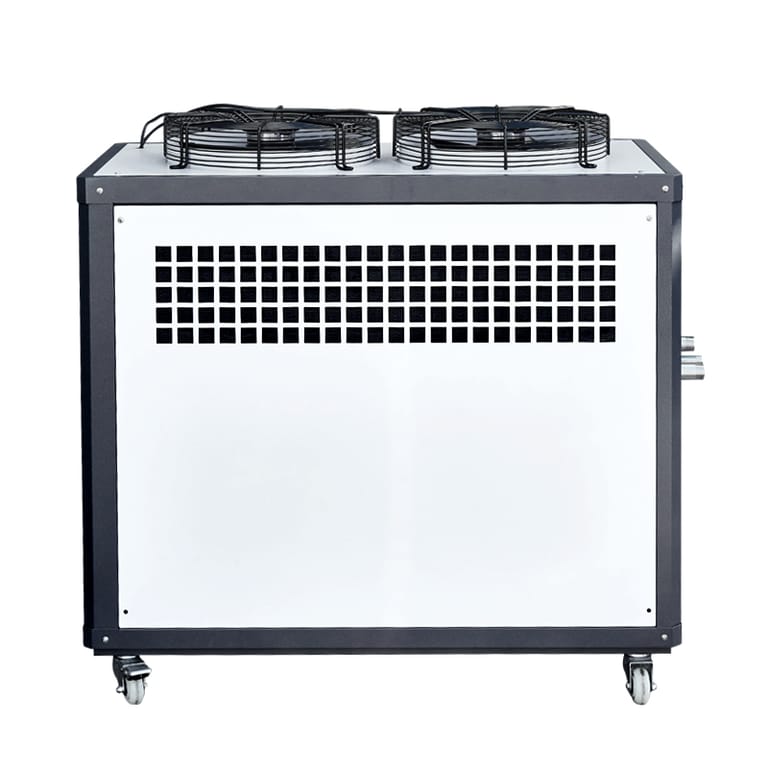 This industrial air cooled chiller delivers reliable temperature control for commercial and industrial applications. Featuring dual powerful fans, a durable metal frame, and easy mobility with caster wheels, it's ideal for cooling equipment, manufacturing processes, or HVAC systems. Designed for efficiency and longevity, this chiller ensures optimal performance even in demanding environments.